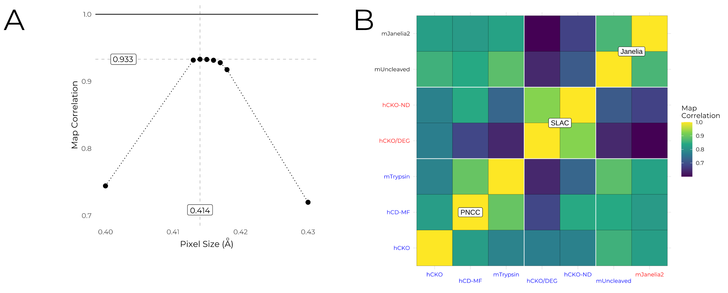 During image processing, I began to suspect that the pixel sizes provided by S2C2 are likely miscalibrated. First, other users reported pixel size calibration issues with S2C2 microscopes around the time these datasets were collected (Patrick Mitchell, S2C2 Director of Operations, personal communication). Second, scaling the CKO/DEG difab pixel size from the nominally-correct 0.43 to 0.414 (a change of approximately 3.6%) changes the map correlation value from 0.72 to 0.93 (Figure A.1 A). Finally, a comparison of the correlation between seven recently-collected ENaC maps shows that S2C2 is an outlier, with unscaled maps generated from data collected at PNCC and Janelia Farm correlating better with themselves and each other than with those collected at S2C2 regardless of construct (Figure A.1 B). I therefore decided to scale both S2C2 maps to correlate best with the same condition and construct recorded at PNCC after processing was complete. I present the models built into the scaled maps in this work.