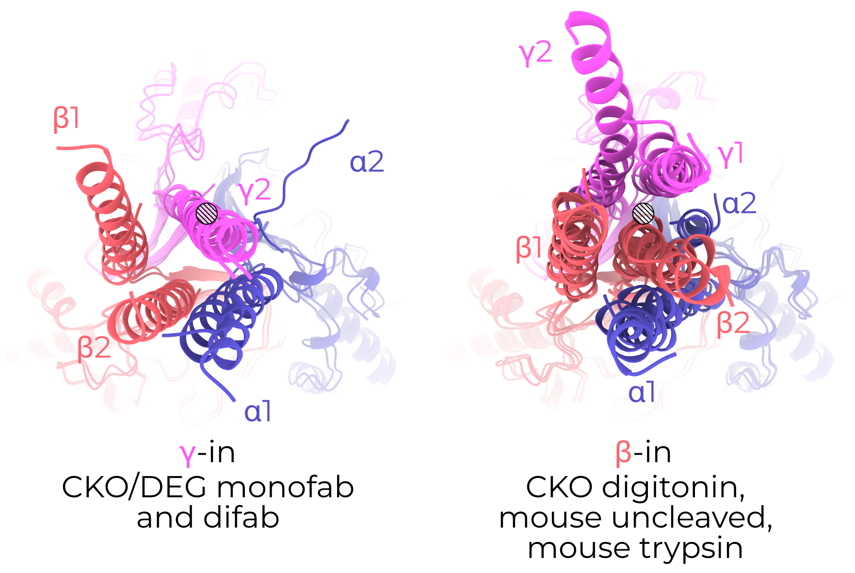 It is important to note that the described mutations were only applied to the human constructs we discuss. All mouse models are wild-type (with the exception of a few residues left from cleavage of GFP off the γ subunit).