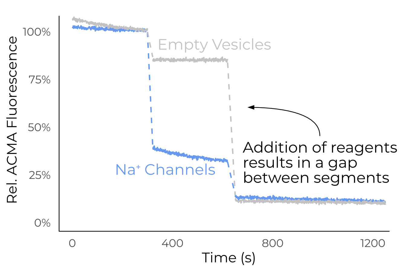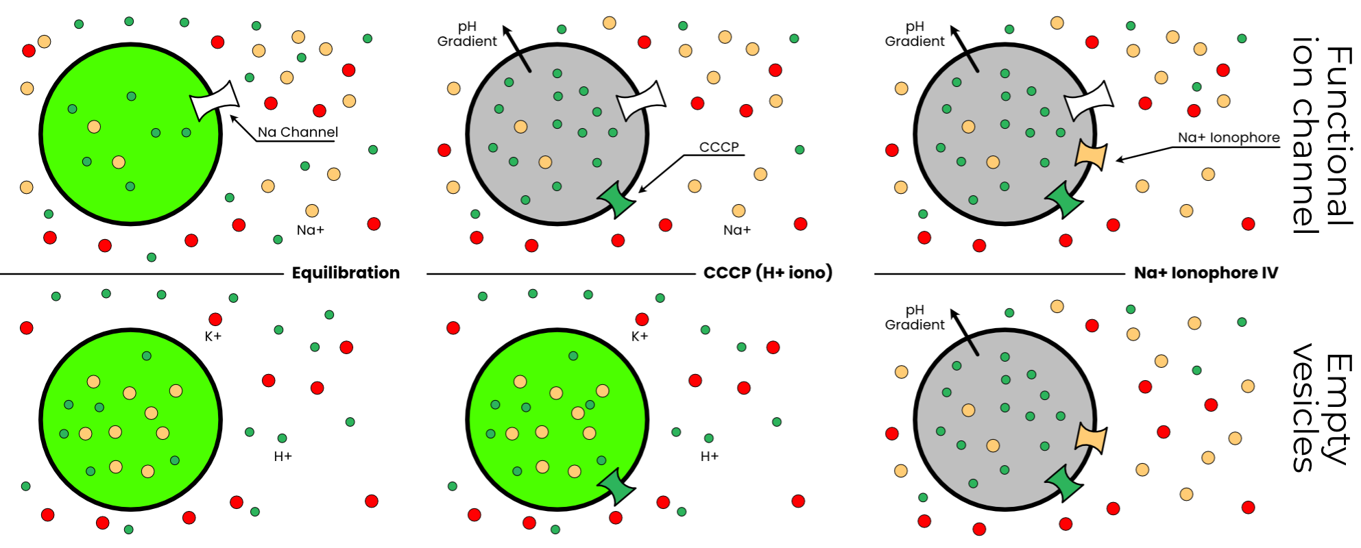 In the canonical K+ flux assay, the protein of interest is incorporated into small unilamellar vesicles with potassium buffer inside and sodium outside (Figure 3.10). Thus, in vesicles with functional sodium-selective ion channels, potassium flows out of the vesicle, establishing an electrochemical gradient. The fluorescent dye ACMA is added to these vesicles. Then, the proton ionophore CCCP is added. In vesicles with functional ion channels, protons pass into the vesicles, down their gradient. This establishes a pH gradient, which quenches ACMA. Thus, reduced fluorescence at the CCCP stage indicates functional ion channels (Figure 3.11). Finally, valinomycin (a K+ ionophore) is added to measure the minimum fluorescence.