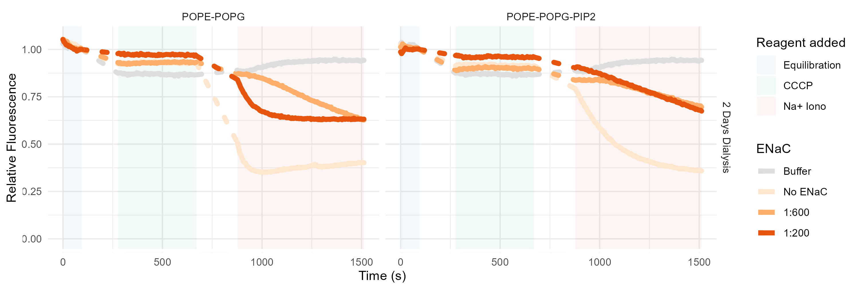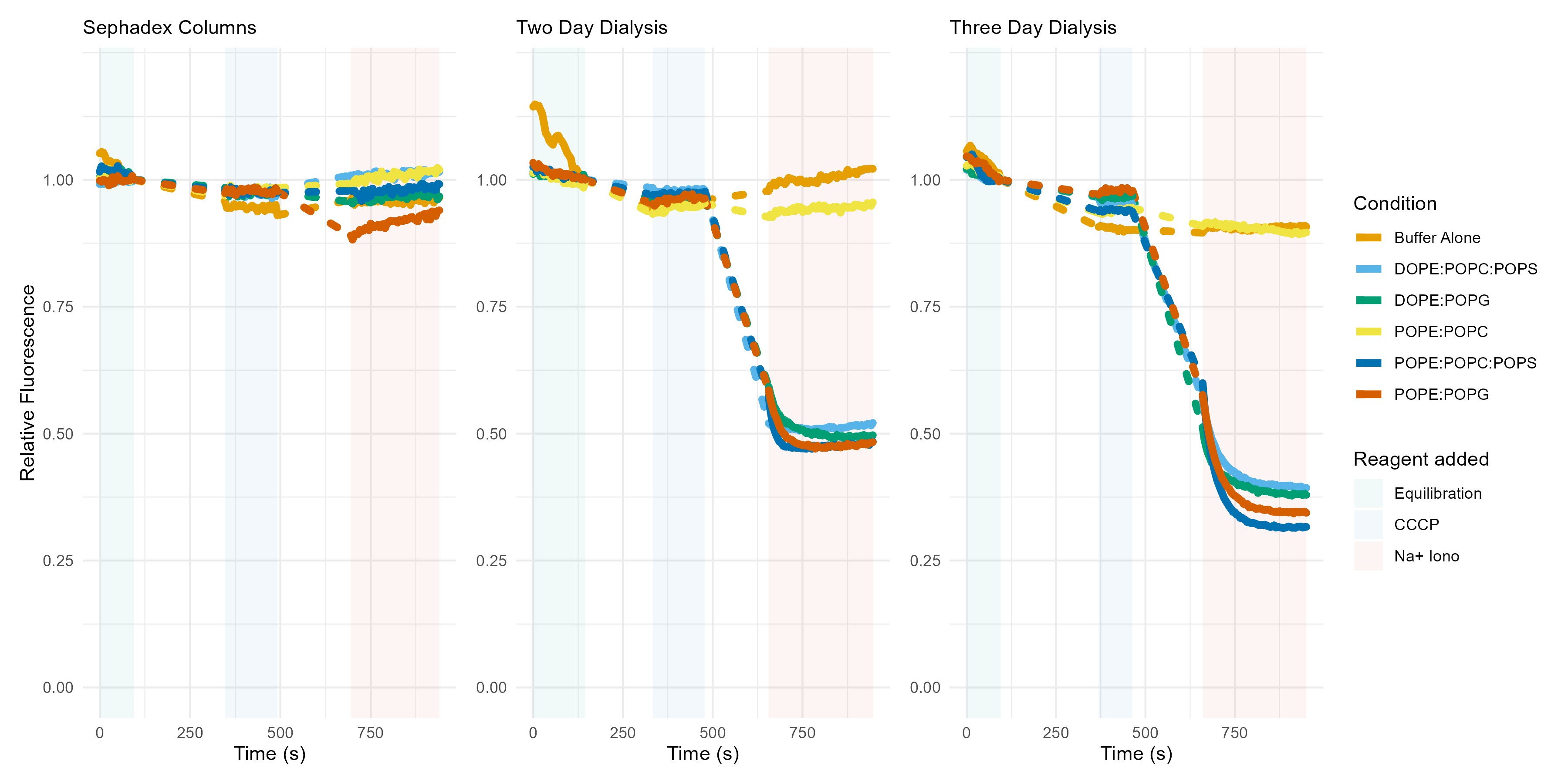 This assay was, in the end, reliably able to produce readings of empty vesicles (Figure 3.12), but ENaC never passed any ions with the addition of CCCP (Figure 3.13). Moreover, addition of ENaC in any amount seemed to disrupt the empty vesicles. It is likely, then, that the ENaC is not properly folded, or that the addition of concentrated digitonin disrupts the vesicles on its own. A good next step in the development of this assay would be a positive control with ASIC or some other sodium channel.